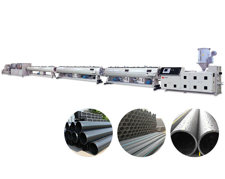 真空定徑箱的特殊設計,可以確保直徑尺寸的穩定和圓整度,速度控制系統,使牽引速度穩定。整條生產線采用PLC控制,液晶屏幕控制面板,操作簡便。可以配備色標擠出機,使生產的管材有色標線
